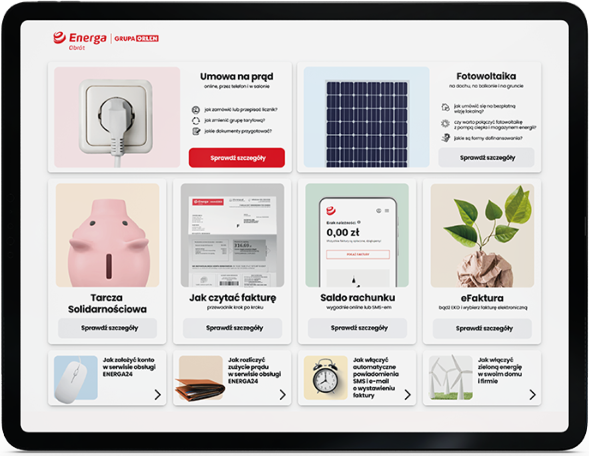 zawarciem nowej umowy czy zmian膮 oferty mo偶na za艂atwi膰 bez wychodzenia z domu. Umo偶liwiaj膮 to formularze dost臋pne na stronie energa.pl. Pomocny mo偶e by膰 tak偶e live-chat, poprzez który mo偶na skontaktowa膰 si臋 z konsultantem. Klienci Energi Obrotu maj膮 mo偶liwo艣膰 za艂atwienia wielu spraw tak偶e poprzez platform臋 Energa24, która od niedawna dzia艂a w zupe艂nie nowej ods艂onie.