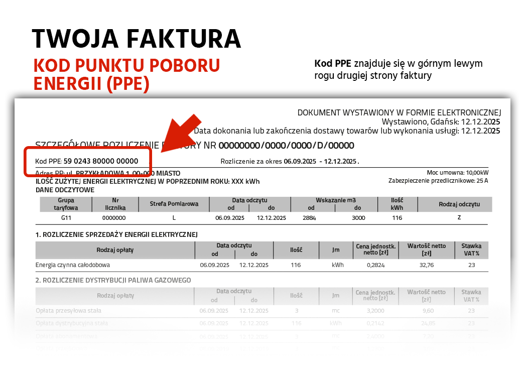 Kod punktu poboru energii (PPE) znajdziesz na drugiej stronie Twojej faktury za prąd, którą dla Ciebie wystawiliśmy.