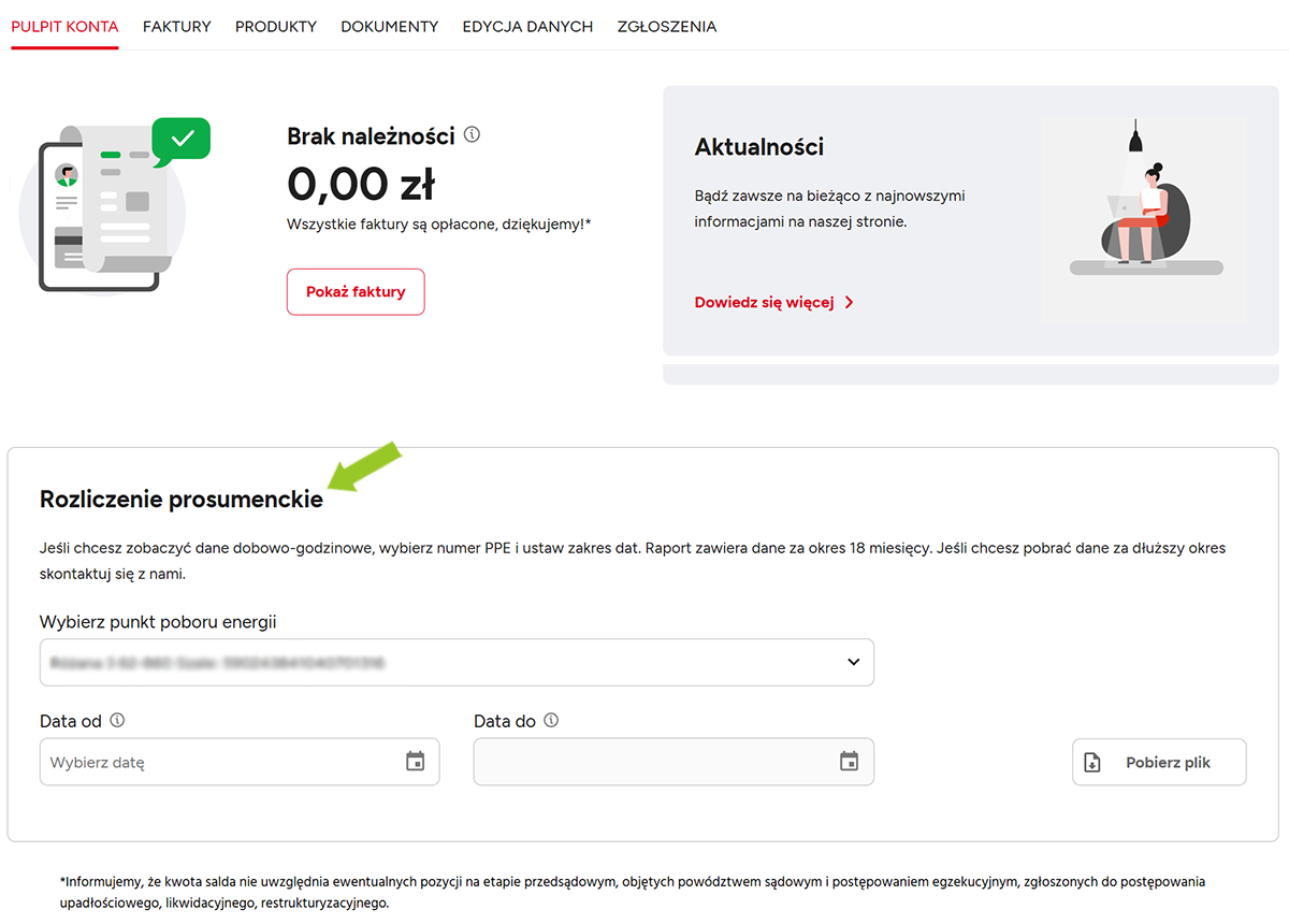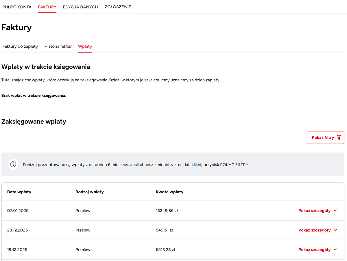 Saldo fakturowe to stan konta fakturowego wynikający z zestawienia Twoich faktur.