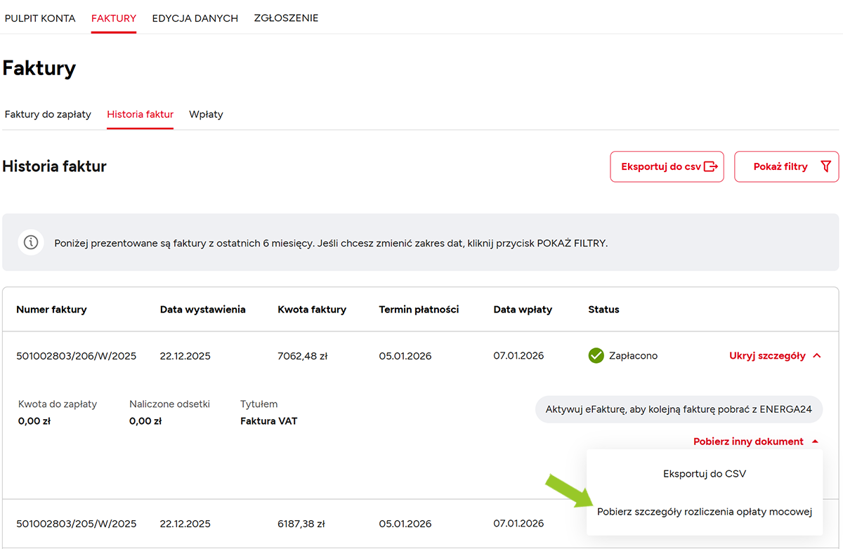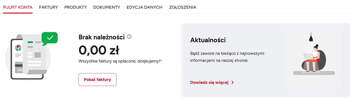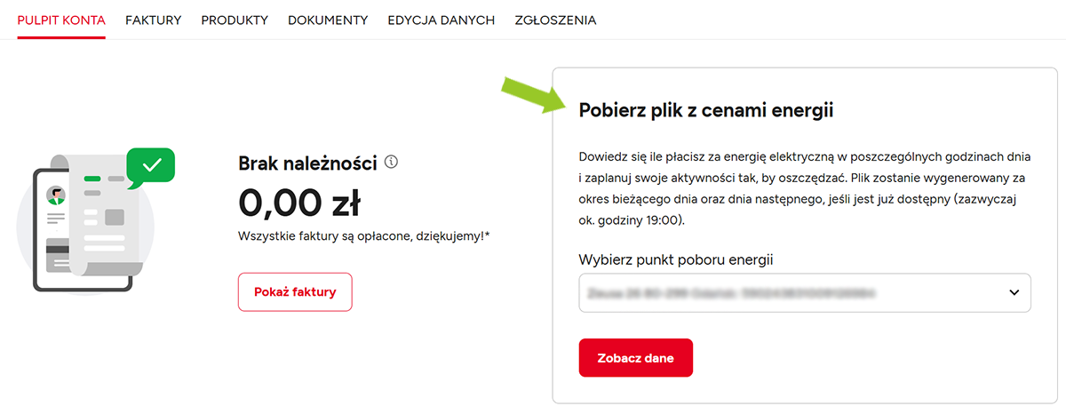- niedopłatę, co oznacza, że na swoim koncie masz nieopłaconą fakturę za prąd. Możesz kliknąć "Pokaż faktury", aby zobaczyć nieopłacone faktury lub kliknąć "Zapłać teraz", aby przejść do bezpiecznej i szybkiej płatności elektronicznej;