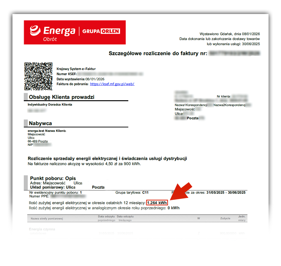 Dane o zużyciu energii elektrycznej w ostatnich 12 miesiącach znajdziesz na swoim szczegółowym rozliczeniu do faktury - we wskazanym strzałką miejscu.
